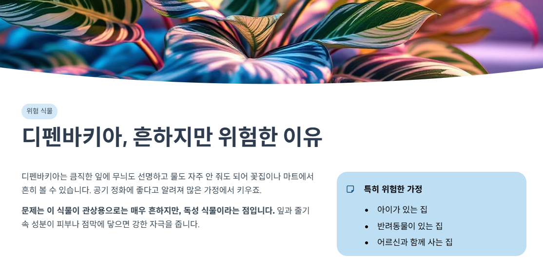 문제는 이 식물이 관상용으로는 매우 흔하지만, 독성 식물이라는 점이에요. 잎과 줄기 속에 들어 있는 성분이 피부나 점막에 닿으면 강한 자극을 줍니다. 겉보기엔 멀쩡한데, 알고 보면 “집 안에 들이면 안 되는 타입”에 가까운 식물인 거죠.