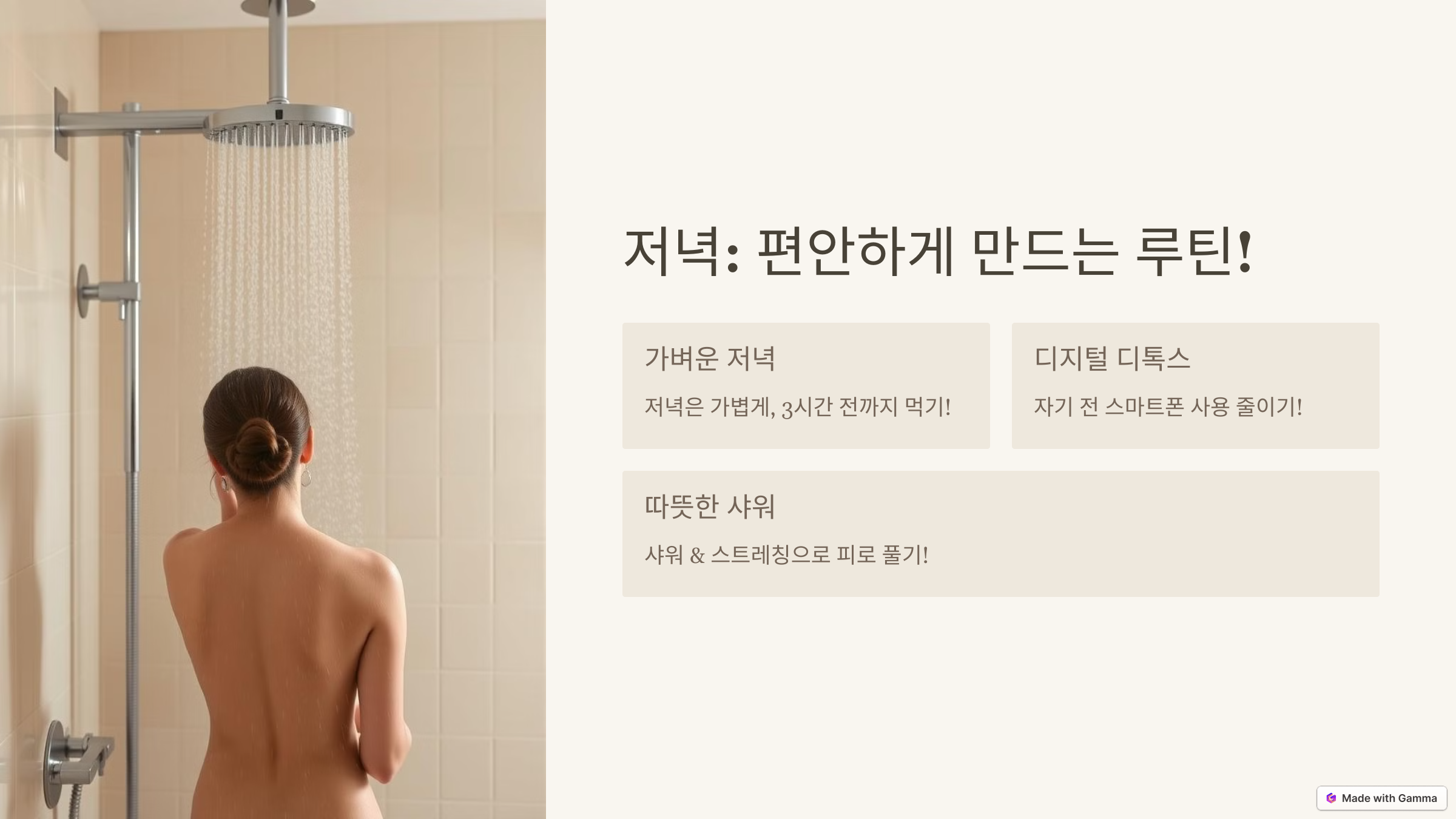 👉 잠들기 30분 전, 핸드폰 대신 책 or 명상 추천!