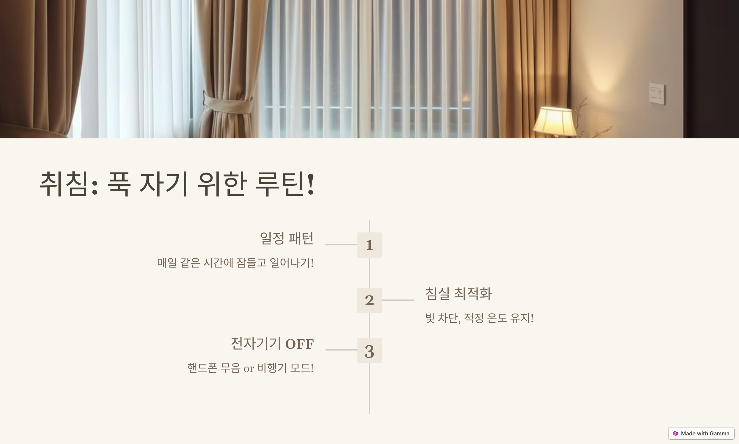 👉 수면 30분 전엔 폰 OFF! 따뜻한 차 마시거나, 가벼운 독서 추천 📖
