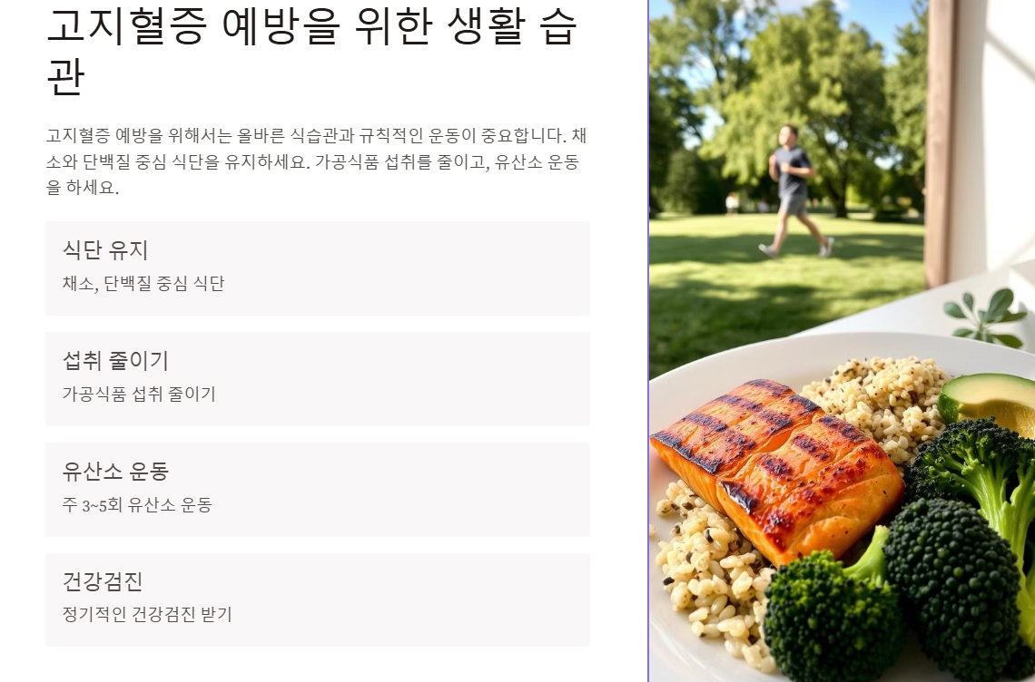 고지혈증 예방을 위해서는 올바른 식습관과 규칙적인 운동이 가장 중요합니다.