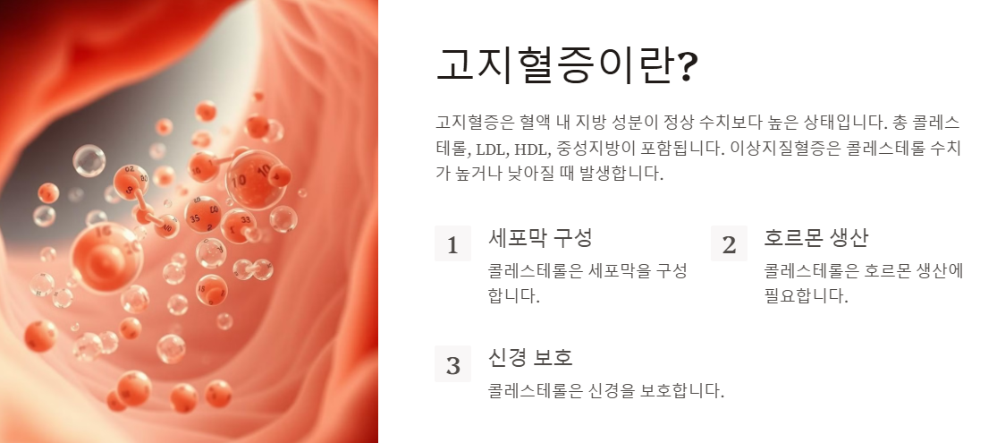 고지혈증은 혈액 내 지방 성분(지질)이 정상 수치보다 높은 상태를 의미합니다. 여기에는 총 콜레스테롤, 저밀도 지단백 콜레스테롤(LDL, 나쁜 콜레스테롤), 고밀도 지단백 콜레스테롤(HDL, 좋은 콜레스테롤), 중성지방이 포함됩니다. 최근에는 ‘이상지질혈증’이라는 용어를 사용하여 콜레스테롤 수치가 높거나 낮아질 때 발생하는 모든 문제를 포함하는 개념으로 정의합니다.