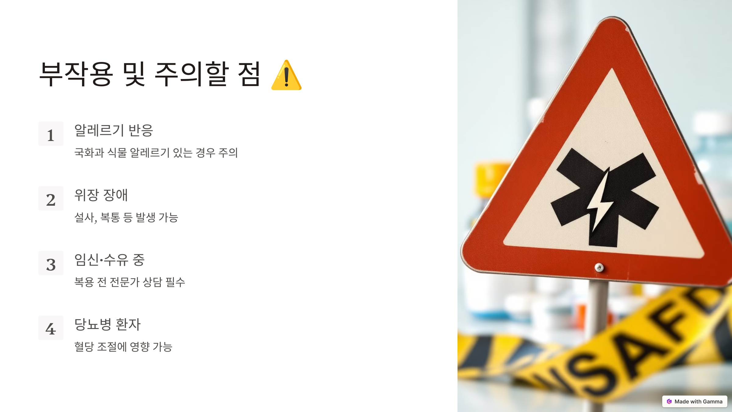 - 당뇨병 환자는 혈당 조절에 영향을 줄 수 있어 조심해야 함