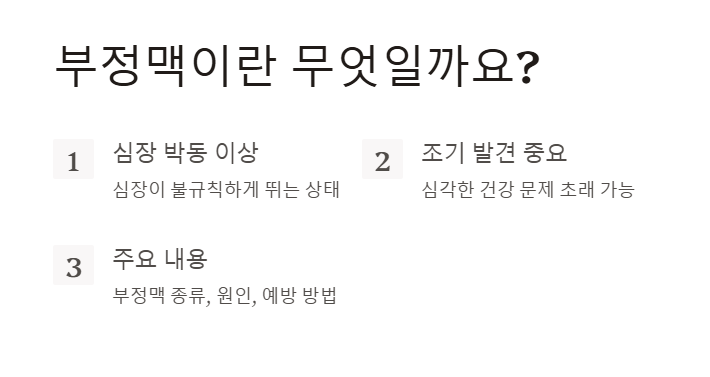 부정맥은 크게 세 가지 유형으로 나눌 수 있습니다. 각각의 유형에 따라 증상과 위험성이 다르므로, 자신의 상태를 잘 이해하는 것이 중요합니다.