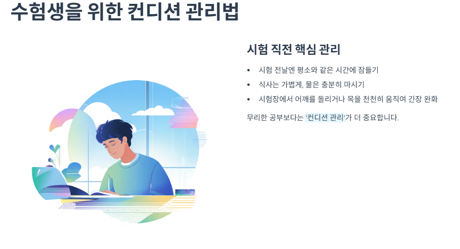 수능 직전의 며칠은 몸과 마음이 모두 예민해지는 시기입니다. 이럴 때일수록 무리한 공부보다는 ‘컨디션 관리’가 더 중요해요. 수면 시간을 확보하고, 식사는 거르지 말며, 두통이 심할 땐 잠시 눈을 감고 심호흡을 해보세요.