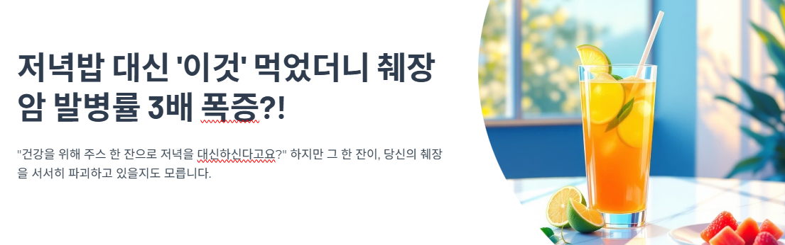 안녕하세요, 요즘 다이어트 중이라 저녁을 간단히 해결하는 분들 많으시죠? 저도 한동안 “주스 한 잔이면 충분하지”라며 저녁을 거르곤 했어요. 그런데 어느 날 건강검진 결과표를 보고 충격을 받았습니다. 우리가 ‘건강하다’고 믿는 그 한 잔이, 사실은 ‘설탕물 폭탄’일 수 있다는 사실을 알게 되었죠. 오늘은 저처럼 속고 있던 분들을 위해, 저녁 대용 주스의 위험성과 췌장암과의 관계를 낱낱이 파헤쳐보겠습니다.