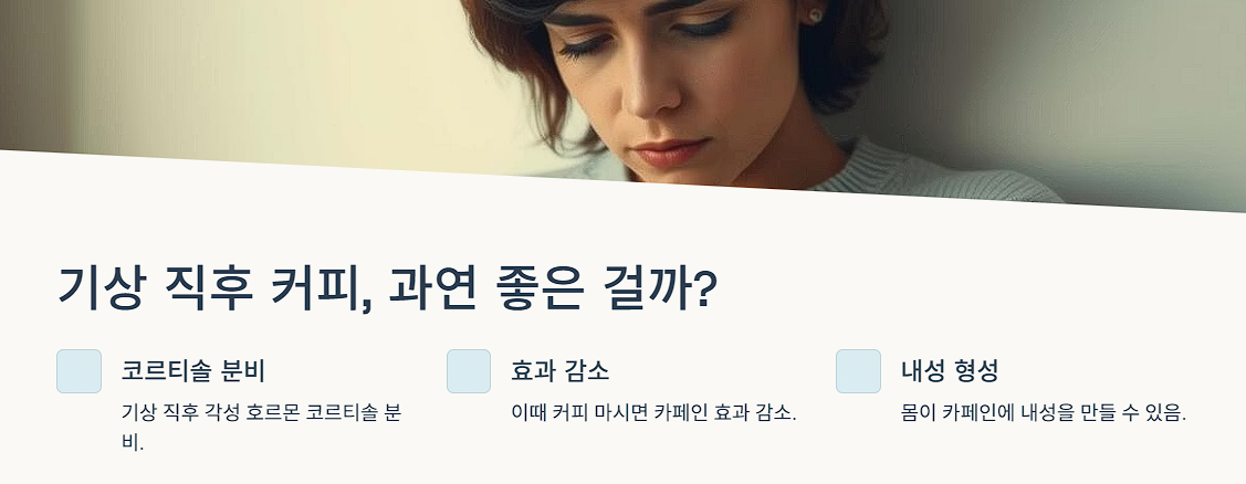기상 직후에는 코르티솔이라는 각성 호르몬이 가장 활발하게 분비되기 때문에, 카페인의 효과가 반감되거나 무뎌질 수 있어요.