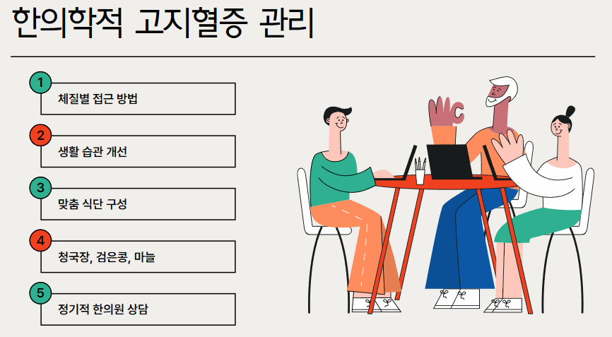 한의학은 고지혈증을 ‘담음’(지질 축적)과 ‘어혈’(혈액 정체)로 보고, 고지혈증 음식으로 체질을 개선한다. 청국장 효능은 혈액 정화, 검은콩은 신장 보강, 마늘은 기 순환에 기여한다.