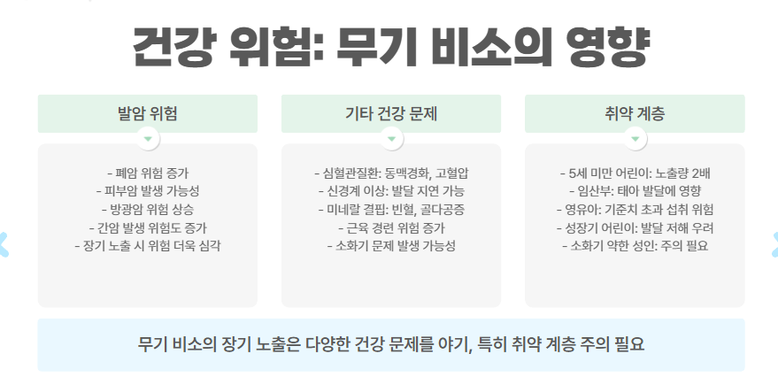 • 영향: 성인은 위험 낮음, 5세 미만 어린이 비소 노출 2배.